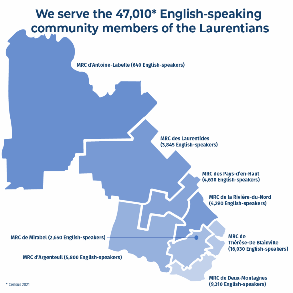 To strengthen community vitality in the Laurentians by using collective impact and direct programming, focusing on access to health and social services for the English-speaking population.